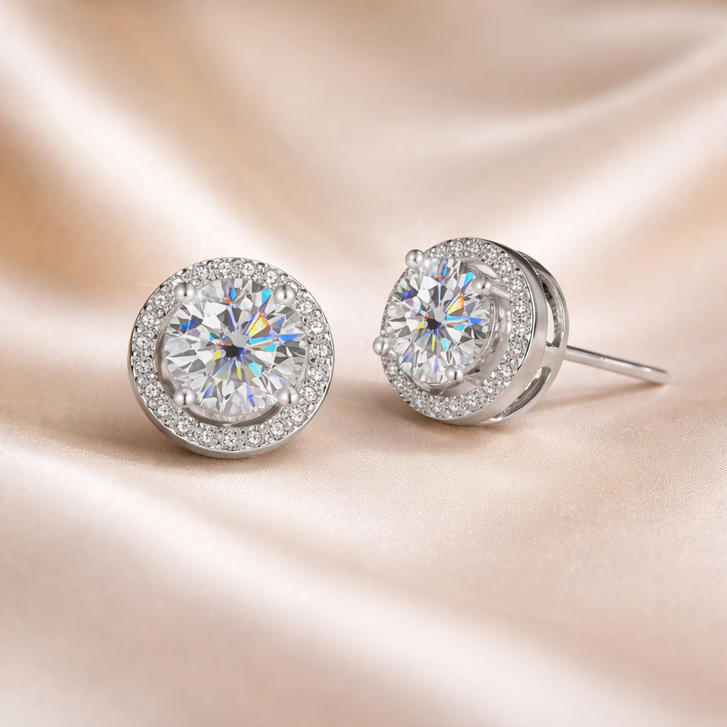 Moissanite stud earrings crafted in S925 sterlingsilver with GRA-certified stones. Choose from white diamond, or vibrant hues including orange, cherry blossom pink, emerald green, blue, and champagne. Available in 1-carat and 2-carat weights with secure earplugs for comfort. Celestial-inspired designs featuring constellation, moon, and starry sky motifs. Each pair arrives ready to wear.
